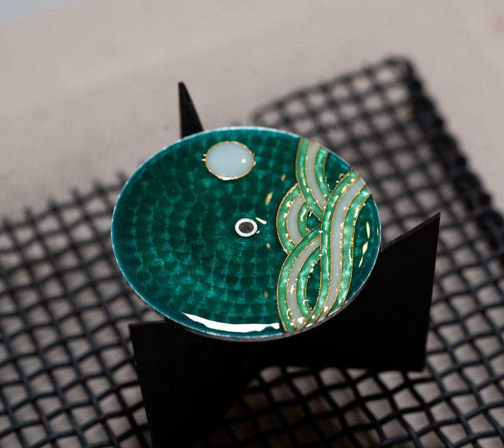 La pièce est ensuite passée au four, à environ 750 °C. L’émail fond, se vitrifie, et ses couleurs prennent de la profondeur. Plusieurs cuissons sont nécessaires pour atteindre l’effet désiré, chaque passage au feu révélant un peu plus la beauté finale du cadran.